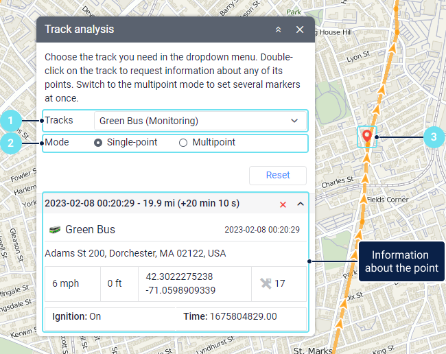- Select the track analysis mode: single-point or multipoint. The multipoint mode allows you to see information about several points in the tool window. When you select a new point in the single-point mode, the information about the previous one is deleted.