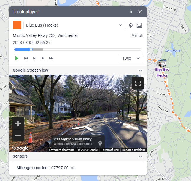 During playback, the address and speed for each message are displayed under the unit name, and the date and time are displayed above the timeline. Besides, you can track the movement of units using street panoramas. To do this, expand the Google Street View or Yandex Panorama sections located below.