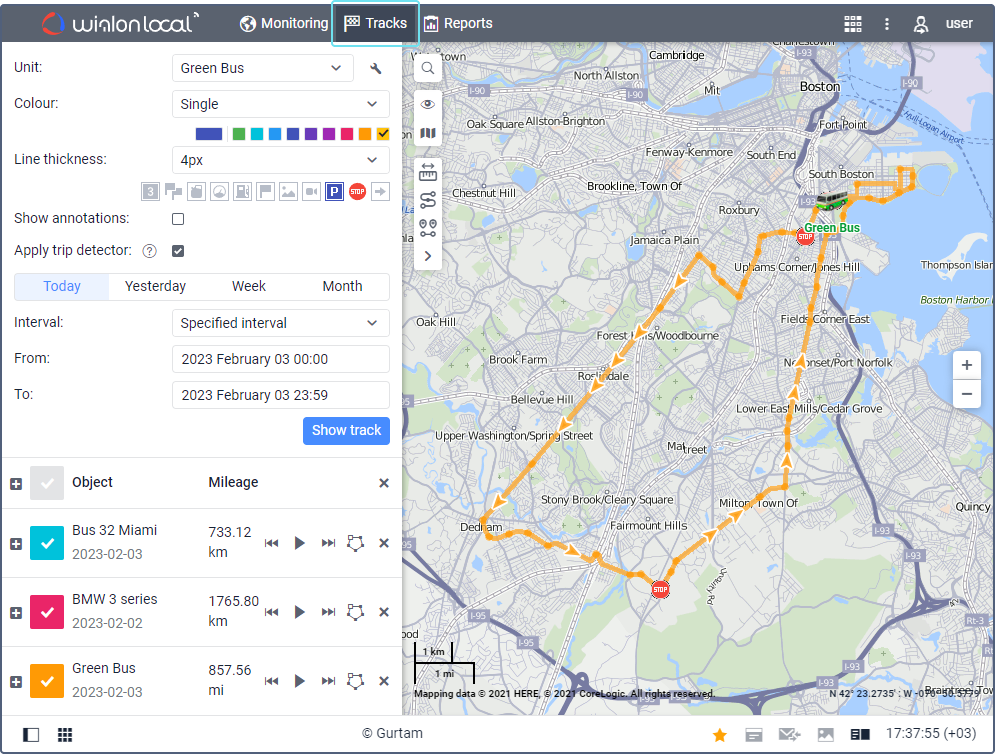 A track is a line of the unit movement displayed on a map. It consists of points from which the unit sent messages to the server.