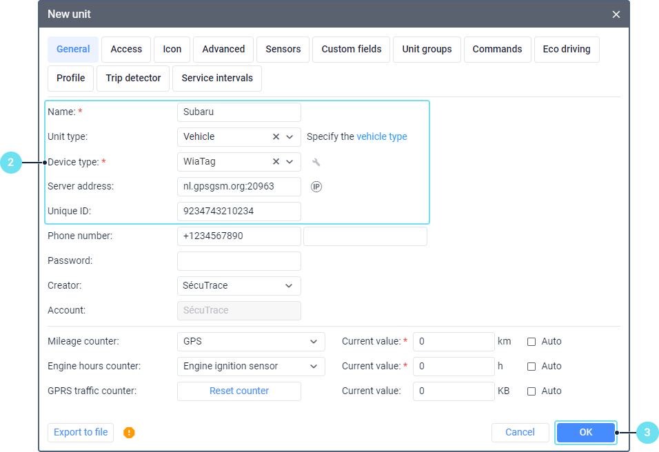 2. Specify the unit properties. To connect a unit to the system, you should fill in at least the following fields on the General tab: