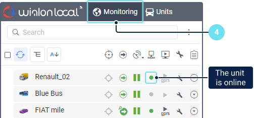 4. Go to the Monitoring tab to which the created units are added automatically. Make sure the unit is connected and is sending messages to the system. In this case, a green marker is shown in its row in the Connection status column of the list.