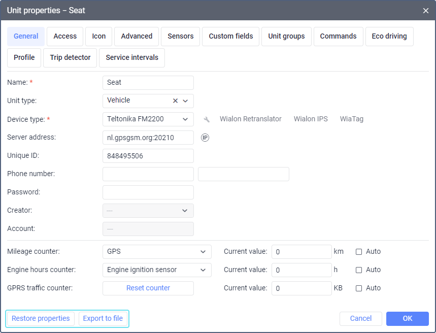 If you change or delete data on a certain tab of the unit properties by mistake, you can restore it. The settings of the properties saved in the last 14 days are available for recovery. These settings are saved automatically on the server once every 24 hours.
