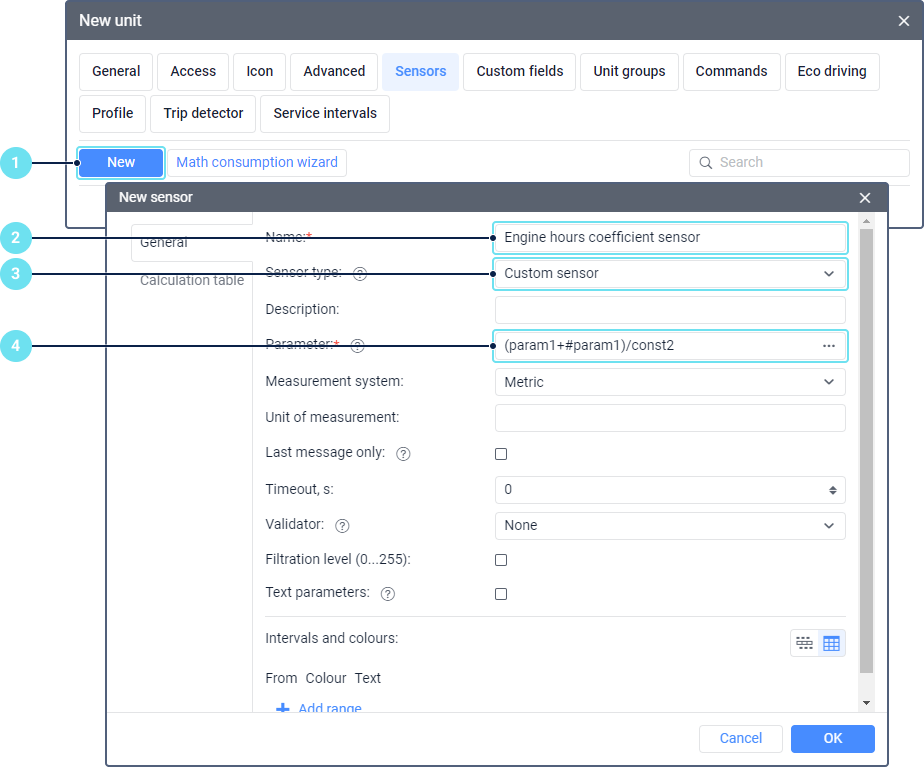 To create a sensor of the coefficient of engine hours, follow these steps: