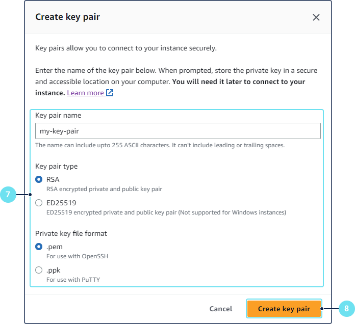 Click Create key pair and save the key pair.