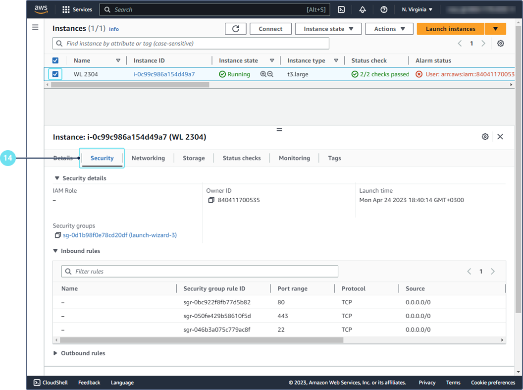 Select the instance and go to the Security tab.