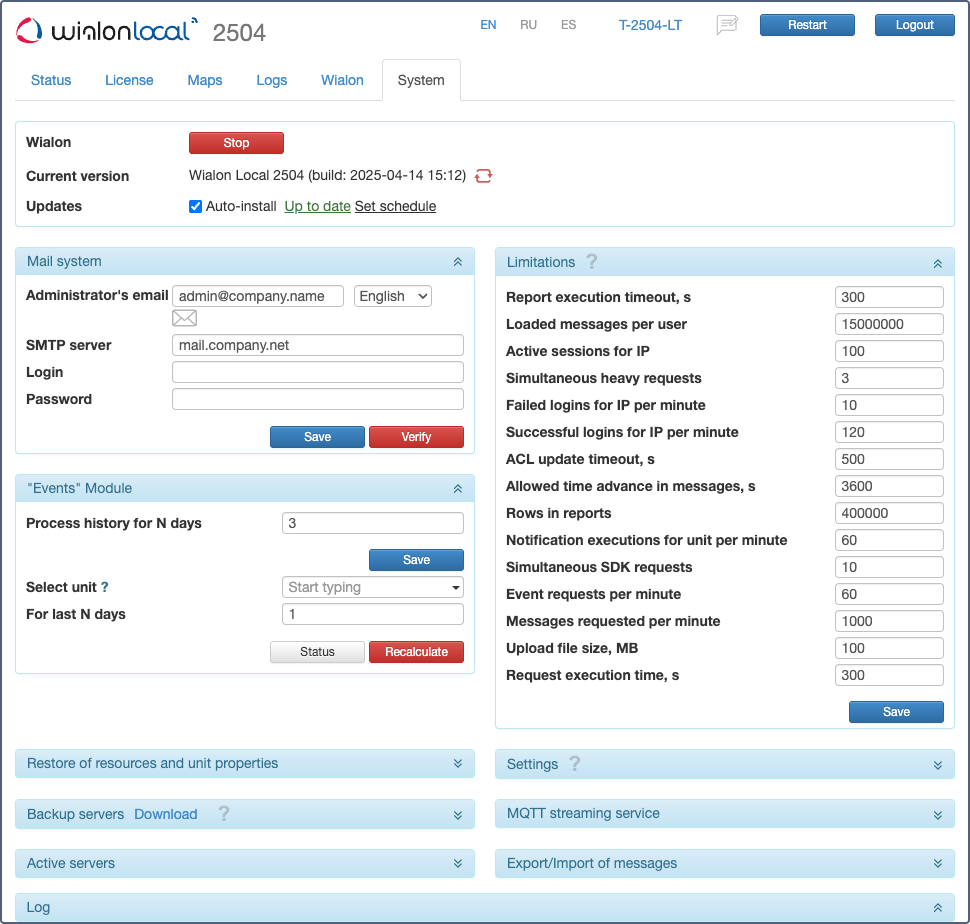 On this page, you can start/stop Wialon Local manually, install updates, adjust mail server, and set important limitations.