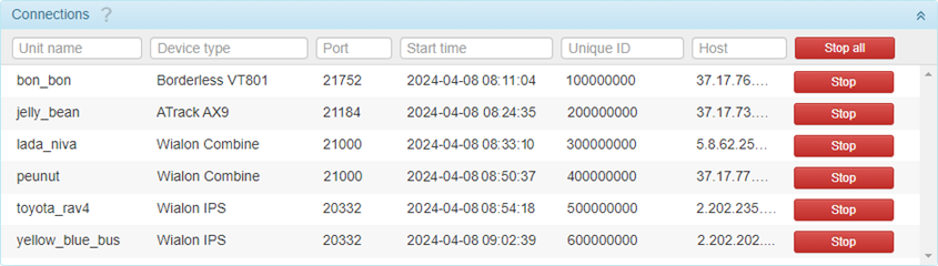 In this section, you can see a table of all units which have a connection at the moment.