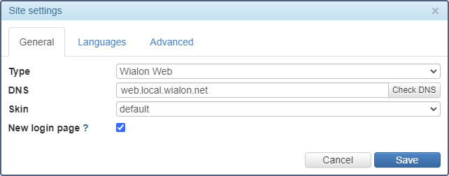 | New login page | This option is used for sites of the Wialon Web type. It is available only for sites with default skins and can’t be applied to sites with personal designs. If the option is enabled, the new login page is shown. You can see an example of it on the Advanced settings page. If you want to use your logo on the new login page (the Login logo option), the image should meet the following requirements: * its size mustn’t exceed 320×72 pixels, * It must be in PNG or SVG format. |