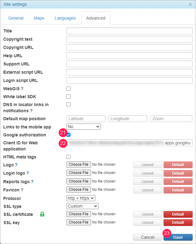 On the Wialon tab of the administration system, find the monitoring site (Wialon Web type) which you want to access using Google authorization and click Change next to its name. On the Advanced tab of the site settings, enable the Google authorization option.