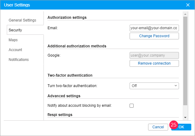 Log in to the monitoring site as the user for whom you want to configure Google authorization. Click Connect with Google on the Security tab of the user settings.