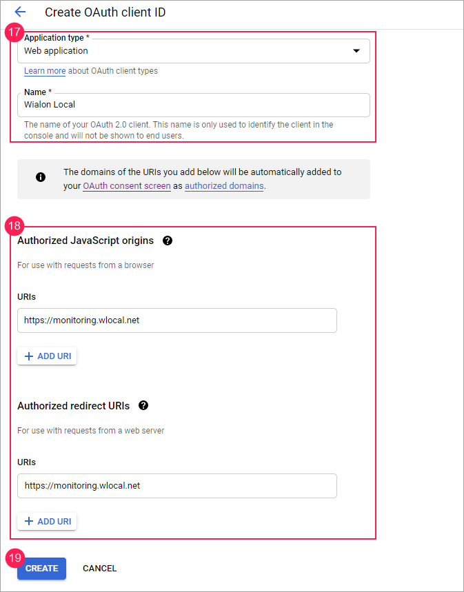Type the monitoring site URI (should be https) in the Authorized JavaScript origins and Authorized redirect URIs fields.