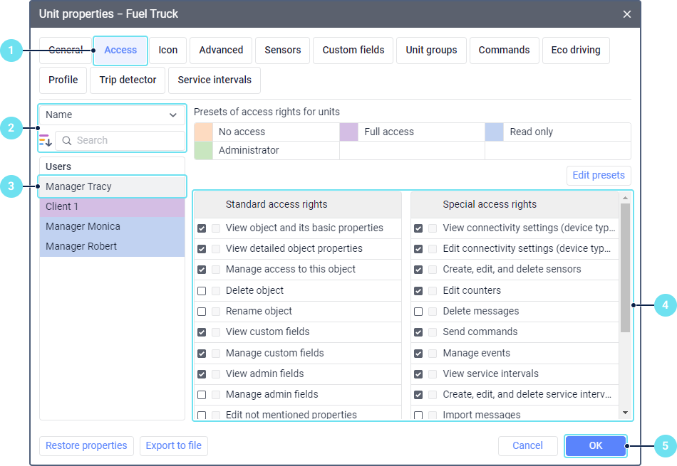 You can grant access rights to a unit, unit group, or resource (account) either in the properties of this object or in the properties of the user to whom access is given. Access rights to users and routes can be granted to a user only in the user properties. These two methods and the particularities of granting rights are described below.