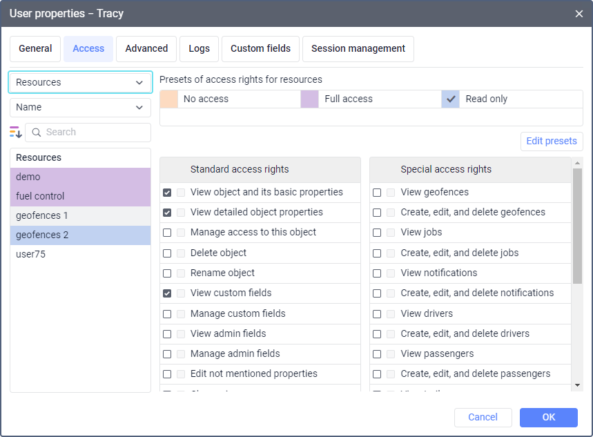 Access rights to resources allow the user to see, create and use their content: geofences, report templates, notifications, jobs and so on. It is possible to work with these objects only in the monitoring system.