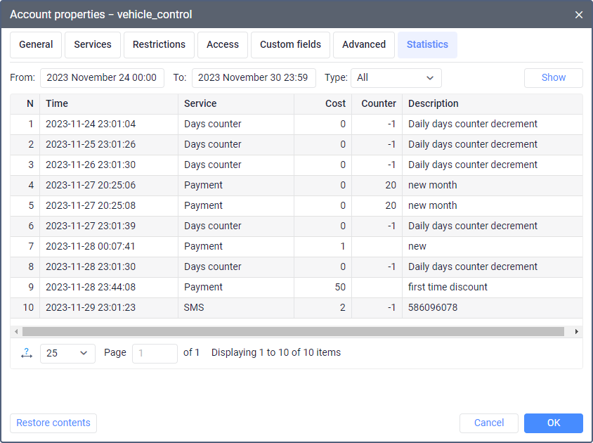 | Counter | The quantity of the used service or the number of added days. If the value is negative, it means the number of deducted days. |