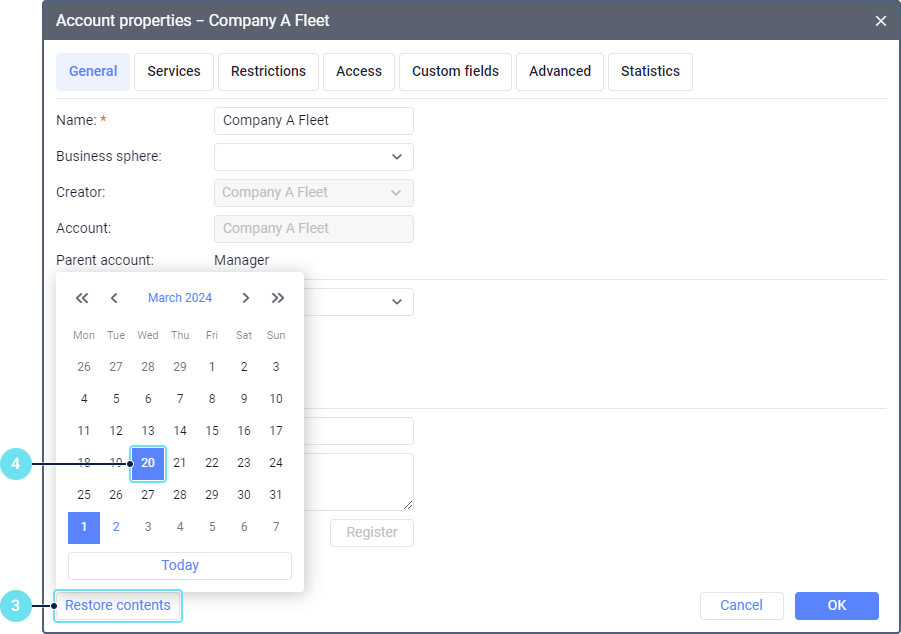 In the calendar, select the date for which you want to restore the resource contents. The dates with the available saved changes are highlighted in blue.