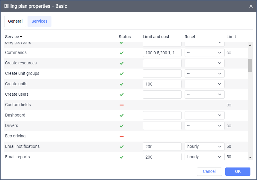 | Limit and cost | In this column, you can specify the values of the service quantity and cost. For example, if you specify number 100 for the Units service, this means that no more than 100 units can be created in the accounts to which this billing plan is assigned. You can indicate the limit and cost for the billing plan in the same way as for the account.You can also specify the service limit and cost individually for each account on the Services tab of its properties. These values can be more than the values from the billing plan properties, but not more than the values from the Limit column. |