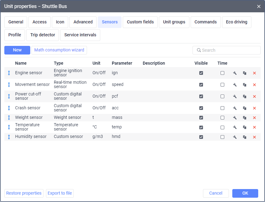 If the required units have already been created, skip this stage. If they belong to another user’s account, you must have the View object and its basic properties access right to this account. - Configuring the required sensors in the unit properties.