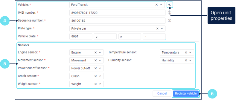 You can’t select a vehicle which has already been registered. The field works as a dynamic filter.IMEI number* Enter the IMEI number of the device installed on the vehicle. It consists of 15 or 16 digits. If the IMEI number is used as the unique ID of the unit, this field is filled in automatically. You can edit it if needed. Sequence number* Enter the vehicle sequence number. It is a serial number, usually consisting of 8 to 9 digits, indicated in the lower-right corner of the vehicle licence card. Plate type* Select the plate type of the vehicle. Vehicle plate* Specify the vehicle plate. As a rule, it is a four-digit number followed by the left, middle, and right letters. -