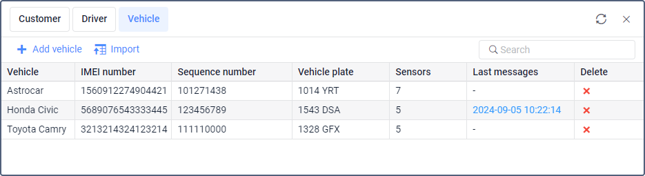 To quickly find a specific vehicle, use the dynamic search above the table. This feature allows you to search for vehicles by name, IMEI, sequence number, plate, number of sensors, and last message time.