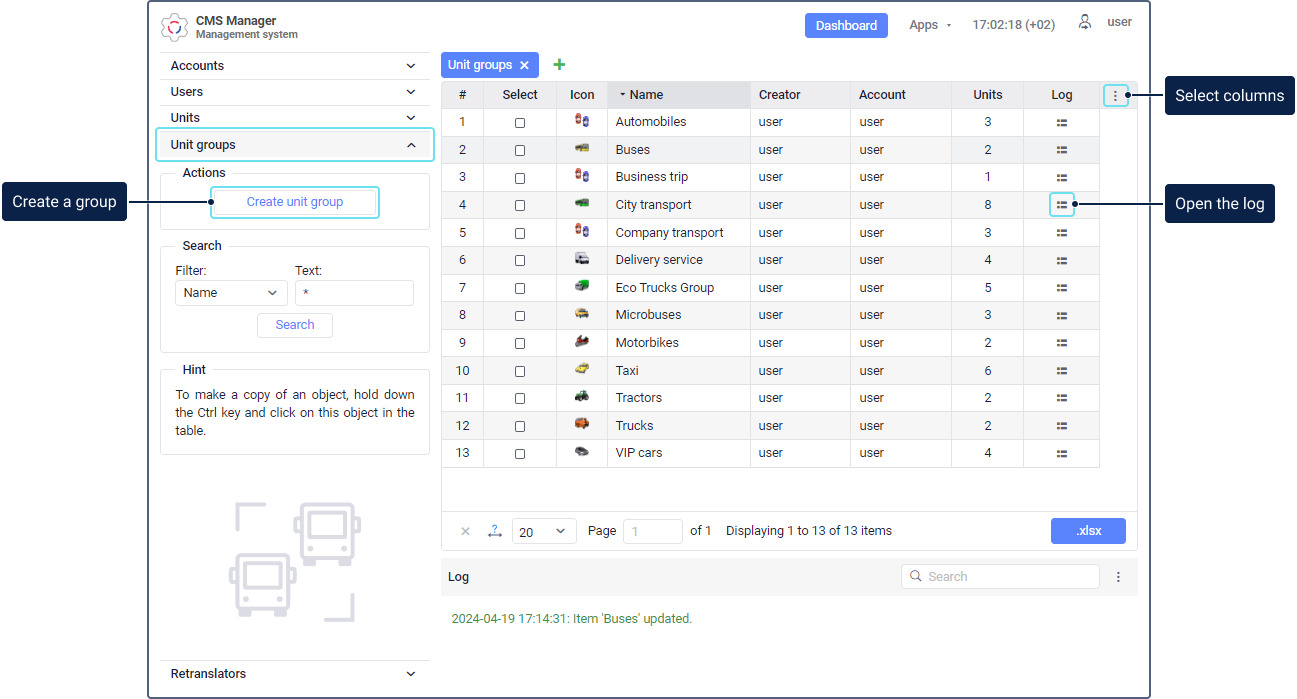 Groups allow you to combine monitoring units by certain criteria. You can work with them in the monitoring system (the Groups mode on the Units tab) and in the management system (the Unit groups section).
