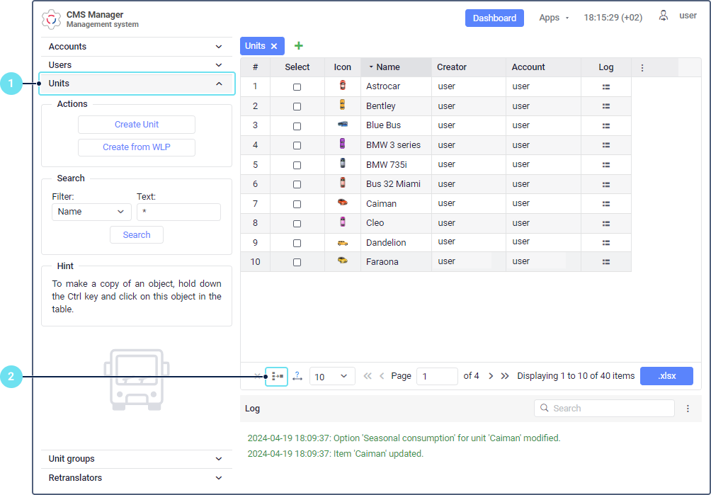 As a result, the account and creator of the transferred units are changed as well as the number of created and available units in both accounts. Units are transferred together with their history, that is, the database with messages from these units. All settings in the unit properties, including access rights, are also transferred.