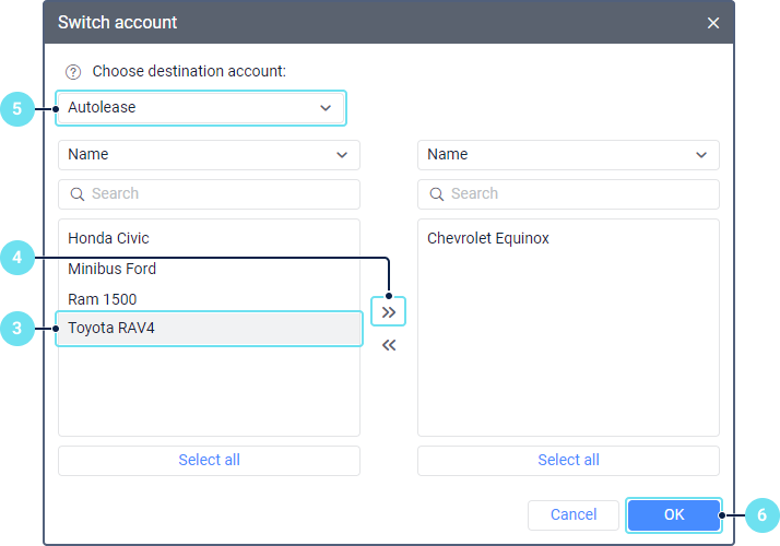 In the left list, select units you want to transfer to another account. To find the required unit, use the dynamic filter above the list.