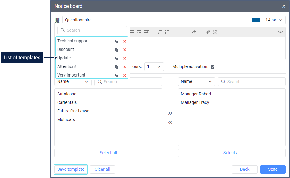 If you want to use or edit a certain template, click on its name in the list. To save changes in the template without sending the notice, click on the Save template button.