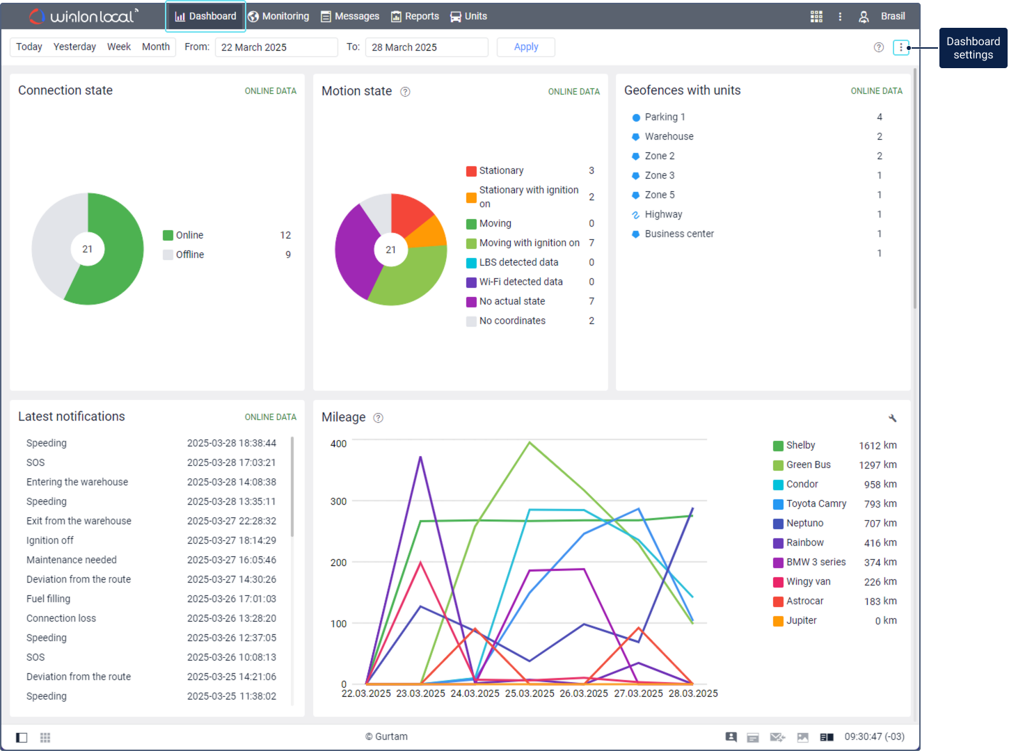 The Dashboard tab contains summary information about the units from the work list. Here you can quickly assess the status of devices installed on the units, see unit connection and motion state, view the latest online notifications as well as the geofences where the units are located, and so on. The information is updated as new messages are received from the units.