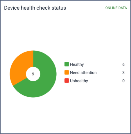 In the individual criterion blocks, devices are divided into categories indicated with green and red colors. Green indicates devices without incidents based on the health check criteria, while red indicates devices experiencing incidents in real time. The Device health check status block also includes a third category, represented in orange, for devices that require attention.