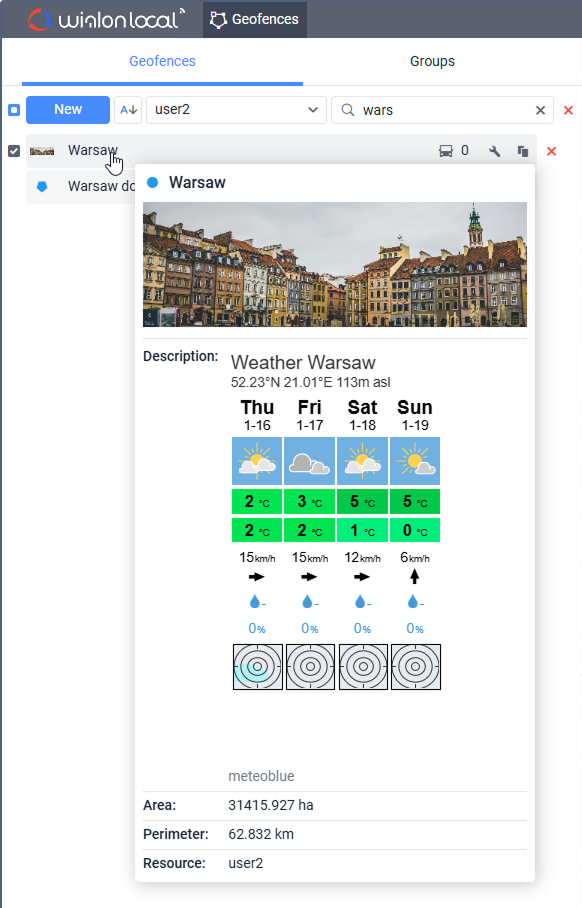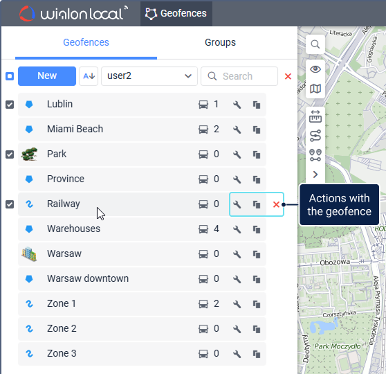 To see the geofence tooltip, point to the name of the geofence in the list or to its icon on the map. You can also point to the geofence itself on the map holding down the Ctrl key.