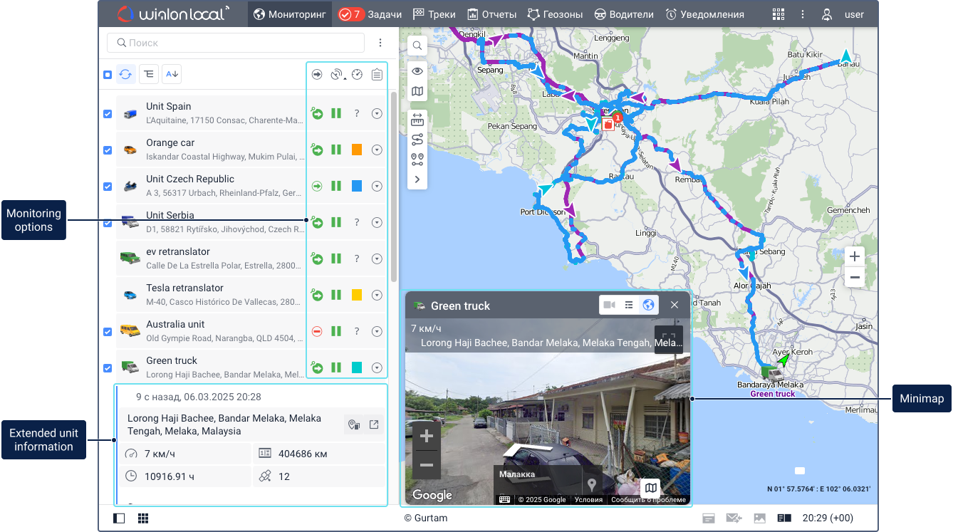 On the Monitoring tab, you can see the work list of units and the map on which you can track their movement in real time. Here you can find the basic features related to tracking units and their parameters.