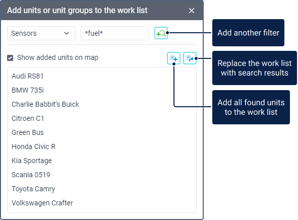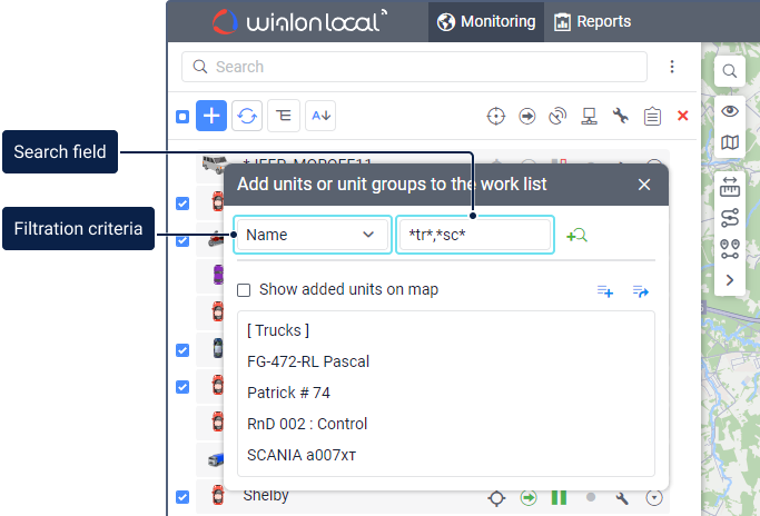 To monitor units, you should add them to the work list. Only the units from the work list can be shown on the map and used in different tasks, such as running reports, assigning drivers and trailers, requesting messages and tracks, searching for the nearest units, etc.