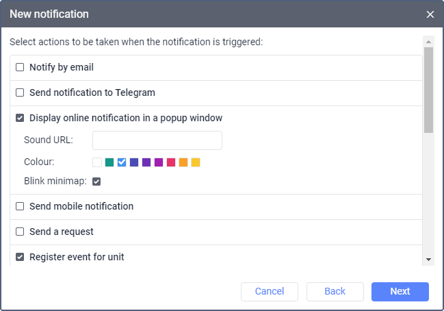Select one or several actions which should be performed after the notification is triggered. It can be sending the notification in different ways, registering an event or performing an action with system objects.