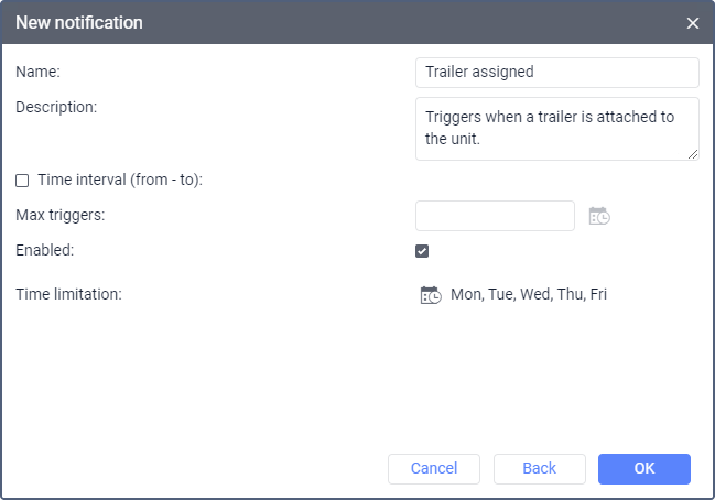 Specify the name of the notification and the parameters related to the time and duration of its triggering. Click OK to save the changes.