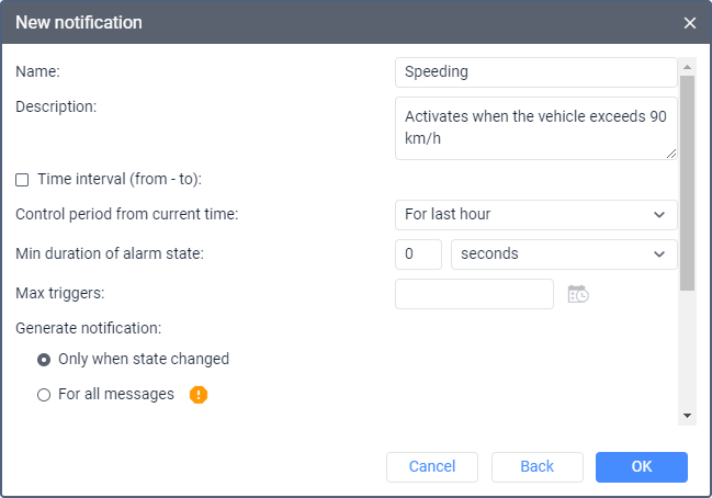 Min duration of the previous state* | The parameter which allows you to prevent unnecessary triggering. Available if the Only when state changed option is selected for the Generate notification parameter. If the time which passes before the beginning of the alarm state is equal to or greater than specified in this parameter, a notification is triggered. This prevents repeated triggering in cases where the alarm state is interrupted for a short period of time. Specify the minimum duration of the previous state in seconds, minutes or hours, and select a unit of time in the drop-down list. The maximum allowed value is 24 hours (1440 minutes, 86,400 seconds). Example. A user has configured a notification of the Speed type with the range of allowed speed from 0 to 60 km/h. The specified minimum duration of the previous state is 2 minutes. This means that if the speed is exceeded, the notification will be triggered only if there have been no speed limit violations for at least 2 minutes after the last triggering. This parameter is applied only to the main triggering condition. For example, in the notification of the Geofence type, it takes into account only the duration of staying inside or outside the geofence and ignores advanced options, such as speed and sensor values. If a time limitation is configured for the notification and the beginning of the previous state falls within this limitation (is outside the specified time frame), the system takes into account the entire interval of the previous state. That is, the notification will be triggered if this interval is greater than the specified value. |