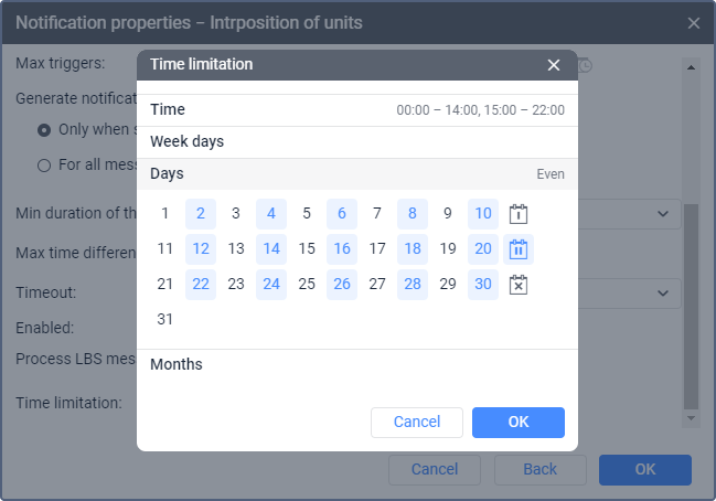 Time limitation | The setting which allows you to specify the time and select the days and/or months during which the notification parameters should be controlled. For example, they can be controlled only on weekdays and within working hours, or only on odd days, and so on. You can learn how to set a time limitation below. Unlike the time limitation applied to the Max triggers parameter, this setting takes into account the time the message was generated, and not the time it was registered on the server. Therefore, even if a message generated on the specified day or interval is unloaded from the black box at a time when the notification parameters shouldn’t be controlled, the notification is still triggered. The exceptions are the notifications of the Alarm and Connection loss types where the time of the message registration on the server is taken into account. If the alarm state starts within the specified day or interval and its maximum duration is exceeded, then the notification is triggered even if the alarm state ends at the time when the notification parameters shouldn’t be controlled. |