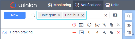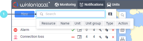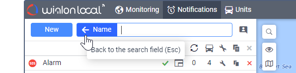 Below the field, you can see all the search criteria that match your request. For example, if you type speed and you have notifications named Speeding, notifications of the Speed type and notifications created for the unit group High-speed vehicles, you will see the Name, Notification type, and Unit group criteria below the search field. - Select a search criterion.