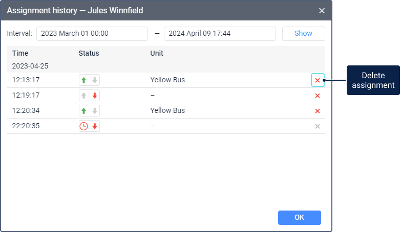 To view the assignment history, specify the required interval and click Show. In the list of assignments, you can see the date and time of the passenger’s assignment or separation, the passenger’s status and the name of the unit.