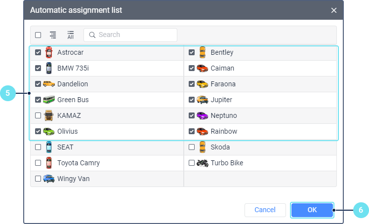 - Select the units or unit groups to which the passengers of the selected resource should be assigned automatically. To switch between the lists of units and their groups, use the icon
