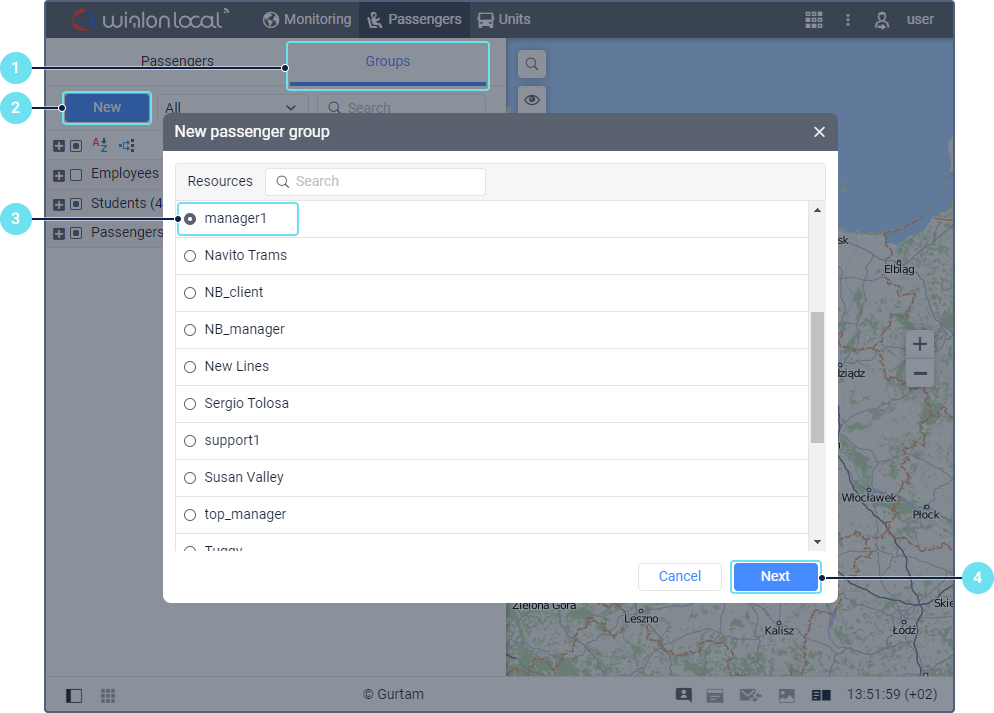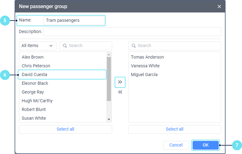 - Select the passengers you want to add to the group. To do this, select the required ones in the list on the left and move them to the list on the right by clicking on the icon