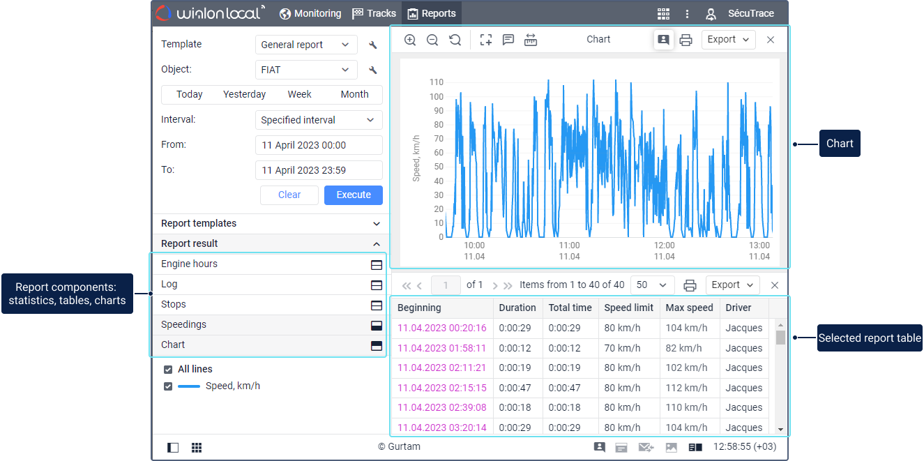 - Reports can include the following components: tables, charts, statistics, a map with tracks marked on it and markers of stops, fuel filling and other actions with the unit.