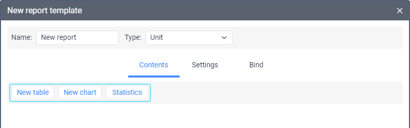 On the Contents tab, you can add tables, charts, or statistics to the report template.
