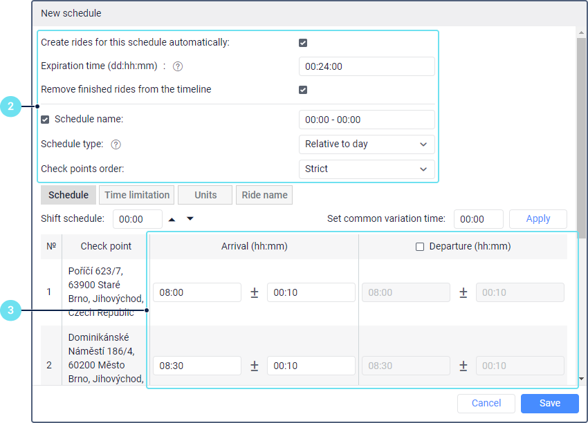 | Schedule name | The name of the schedule. By default, it consists of the time of arrival at the first and last points. To specify a different name, check the box in front of this field and enter a new name. |