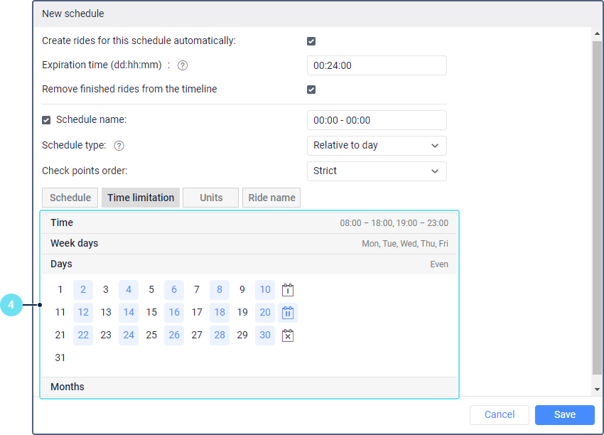 Absolute | A schedule of this type can be used only for rides created manually and only on a certain day. This day is indicated on the Schedule tab next to the time of passing check points. The time of passing check points is relative to the day. |