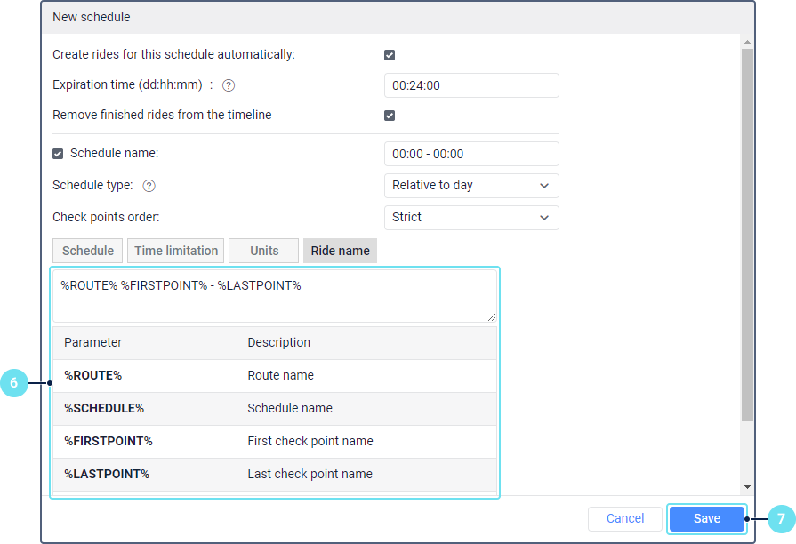 | Create rides for this schedule automatically | When this option is enabled, rides for this schedule are created automatically without an operator. The option is available only for the Relative to day schedule type. In order for this option to be active, you should go to the Units tab and select one or several units that should be assigned to rides according to this schedule. Rides are created automatically when the time before the scheduled time of arrival at the first check point is equal to the number of minutes specified in the variation field. |