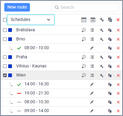 The created schedules are shown in the work list below the route name if the Schedules information type is selected in the drop-down list.