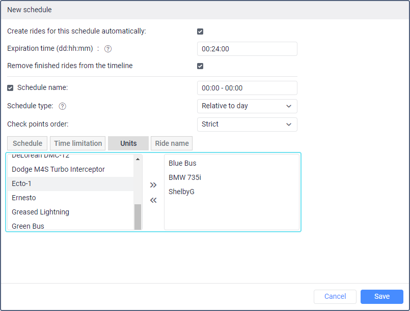 On the Units tab, select the units that should be assigned to rides according to this schedule, if the automatic creation of rides is enabled.