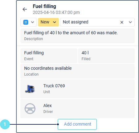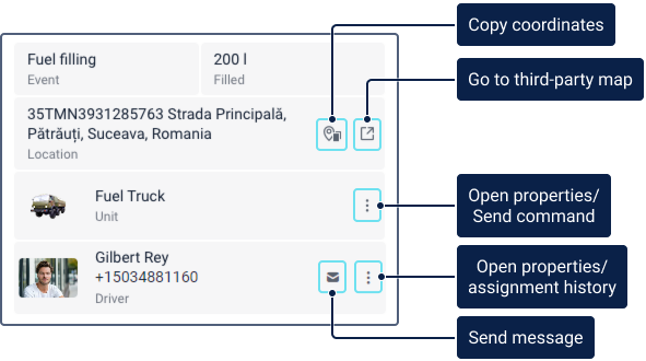 This block shows the icon, name and phone number of the driver assigned to the unit at the time of the event. You can also use the iconwhich allows you to open the SMS tool. You can use it to send SMS messages to the phone number specified in the driver properties.The icon is inactive if the requirements for sending SMS messages from the monitoring system are not met or the phone number is not specified in the driver properties. You can also open the driver properties or the history of assignments. To do this, click on the icon and select the required item. |