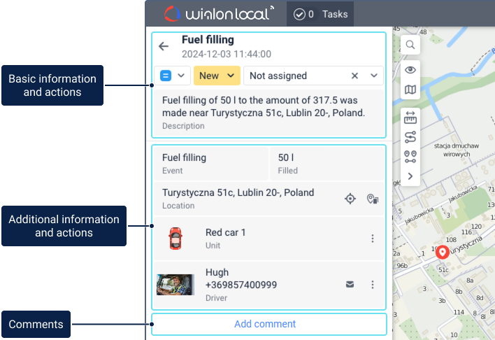 The location of the event related to the task is shown on the map if the coordinates are available.
