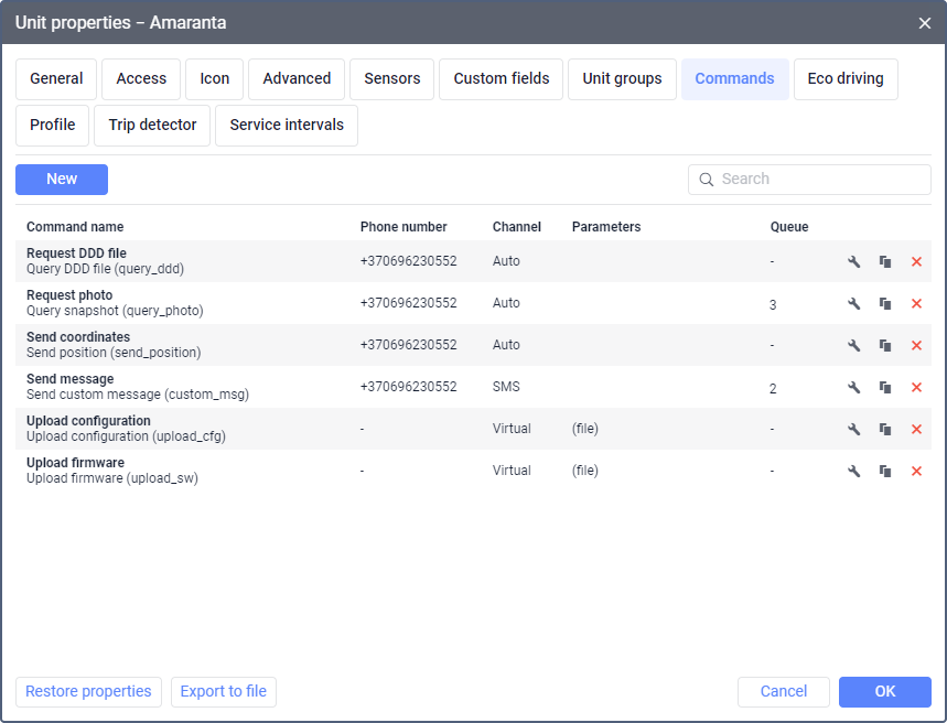 On the Commands tab, you can create and configure commands which should be sent to the unit.